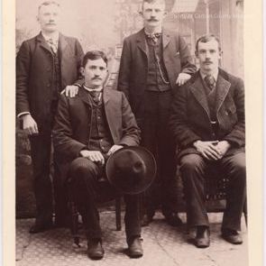 Black and white studio portrait mounted on card of 4 men all in suits and ties and mustaches . Two in back have hands on the shoulders of the man in front. Man sitting on left is holding a hat and man on right has hands in lap. House backdrop behind.