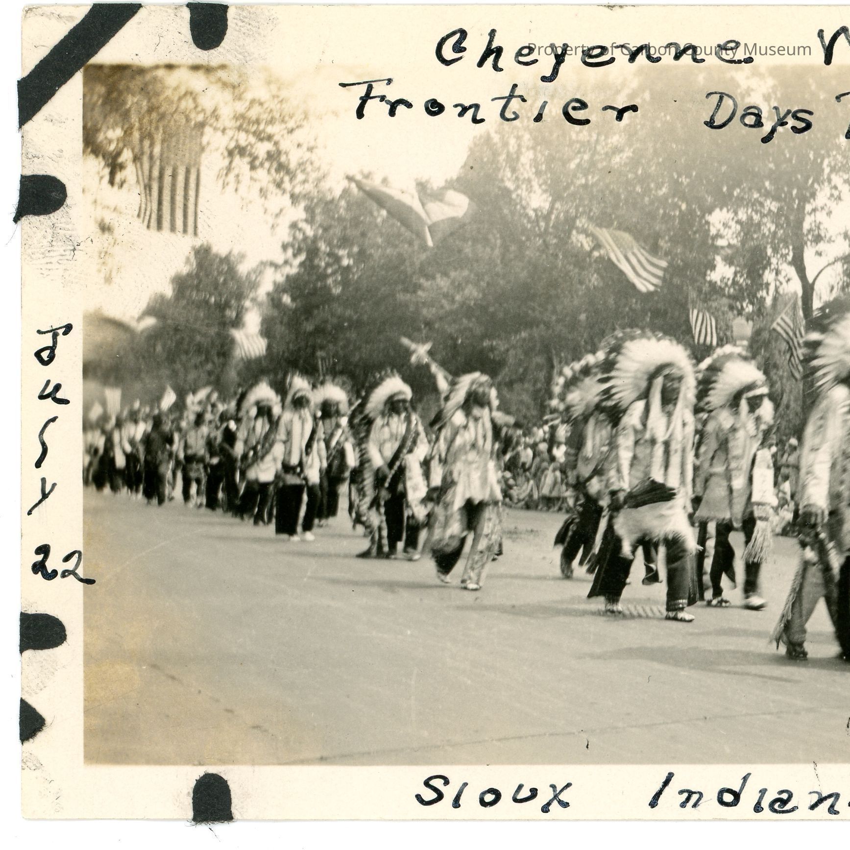 Black and white photograph. A group of Native Americans wearing traditional clothing, including headdresses, is walking down the street as crowds watch. Along the top of the photograph is written "Cheyenne Wyo Frontier Days Parade", the bottom "Sioux Indians", vertically along the left "JULY 22", vertically along the right "1931". The number 2 is printed on the reverse.Collection