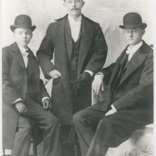 Black and white glossy copy print of three gentlemen all in Derby hats and 3 piece suits. Man on left has gloves and is seated. Next man is standing, holding gloves and he has a mustache. Next man is seated on decorative bench.