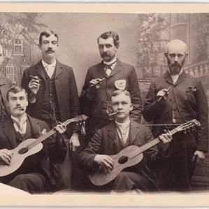 Black and white cabinet card & copy print of 6 men all smoking cigars. Four are standing with mustaches and suits, two are sitting wearing suits, holding guitars . Painted backdrop behind. Bright white spot on right.