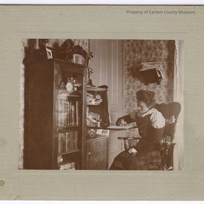 Update - 2009: Black & white print attached to ecru matboard with decorative embossed with scallop design around edges. Print shows a woman sitting in a high back wooden chair at a secretary type desk writing on a sheet of paper on the top of the folded down door surface of secretary. A glass door bookcase is on left side of the desk portion. books, mantel clock and photograph are seen through the door. Ornate wallpaper & wall is at her back with closed wooden door to her right. She is wearing plaid skirt and a blouse whose lower arms and bodice are black and upper sleeves with shoulder collar and neck edge are light striped fabric. Her dark hair is in an updo. Her left hand is in her lap & she is holding a white handkerchief. A dark magazine rack is attached to the wall above her head filled with papers. Ornate statue is seen right side on top right of secretary.