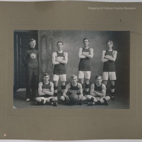 Update 2/2010: Black and white print, studio portrait. Mounted on brown matboard with raised "frame" around image. Full length portrait of the Rawlins High School basketball team and coach. Posed in front of a painted scenery backdrop. Team members are wearing uniforms, man standing at left is dressed in dark pants and a dark turtleneck with RHS logo on front. Young man seated at center front holding a basketball.