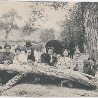 Black and white photo of a group of people (9) sitting behind a log with a mule in the background. Man on left has white hat and suit with a handerchief; next is a girl with dark hair parted and pinned back. She is wearing dark dress, hands in front. then is a girl with hair pinned up, dressed in white with one hand on her cheek. Next is an older man with dark cowboy hat, resting head on his hands. he has a beard. Next is a woman in a dark dress, hair pinned up, with her right hand on her cheek. Next is another woman in white, hair pulled back, arm on log. Next is a woman older, with hands under chin, in a light dress. A man is next with hair parted in center, both hands under chin on neck. Last or one on right is a woman in white blouse, hair pinned up, both hands on neck, elbows on log.