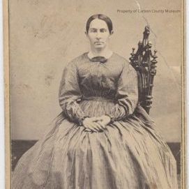 Black and white portrait on a mat with double thin line around. Woman is sitting on a chair, hands crossed in lap. She is wearing a checked dress, white collar and bow. Her hair is parted in the middle and pulled back.