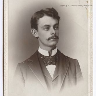 Update 2008: Black and white print attached to white tagboard. Studio portrait shows a young man with dark hair with high right part. He has dark eyes nd a dark mustache. He is wearing a dark three piece suite with a white shirt with high neck collar that does not fold down. A dark patterned tie which surrounds collar lies in a flat, wide bow on shirt surface.