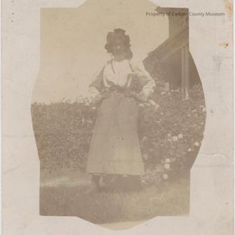 Black and white snapshot glossy of a woman standing outside in front of a rose hedge and house. She has on a dark bonnet untied, white blouse and long grey skirt. Her hands are on her hips and she wears gloves. Photo is an oval and square combined.