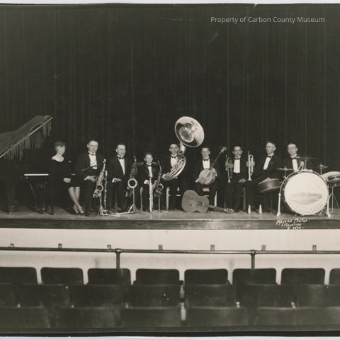Update 1/2008: Black and white contract print. Image of a 9 piece band posed with their instruments on a stage. Seven men, one woman, and a boy. Woman is seated at a piano (back to instrument for photo) she is wearing a short long-sleeved black dress and heels. Men and boy are dressed in Tuxedos, two men and boy appear to play saxophone and clarinet(?). One man plays the tuba. Another the guitar and banjo. Two men play trumpet and one is the drummer. Painted on the drum set is a prairie with low hills and the band's name which appears to be Sagebrush Syncopator's.