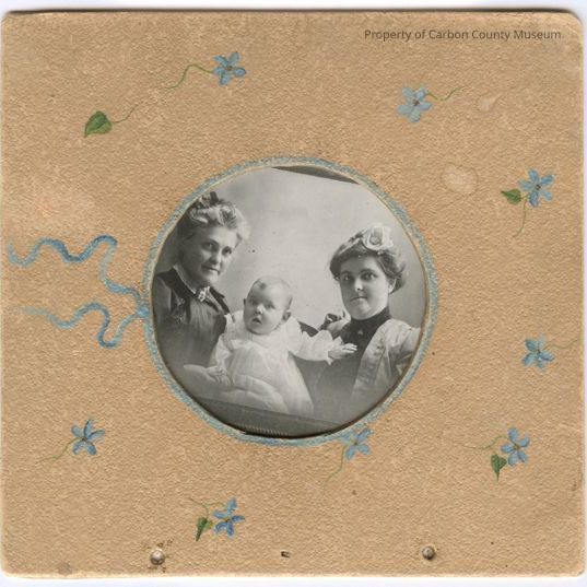 Written on back in blue green ink, left, Mrs. Edwards, P.E. Daley's grandmother. Center, P.E. Daley as a baby, Right P.E. Daley's mother.