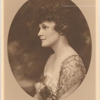 Large black and white copy photo of a woman in an oval print with mat around. Profile of woman with short curly hair, long neck. Her beaded lace dress or blouse is short sleeved with low neckline. No jewelry. Written in pencil on bottom right: J.H. Elliot."