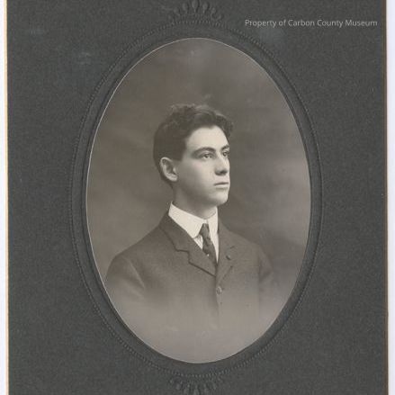 Update 2008: There are two identical black and white oval portrait prints mounted to black tag board of a young man with dark hair and eyes wearing a dark jacket with a high collar white shirt. A black tie with small white dots is tied with small tie knot and hangs down under jacket at center front. Jacket has very high lapels. Outer embossed decorative border surrounds oval print.