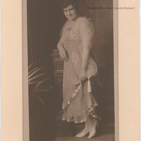 Black and white copy print (rectangle with mat around) of a woman in a very lacy and thin strapped dress. Her right arm is resting on a stand and her left holds part of her lace net near a white tassel. She wears white heeled shoes and has short hair. She has a ring on her right hand.