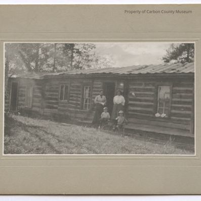 Update 2009: Black and white photos of a large log building. Standing in the doorway on right end of the building are two ladies and two young children. There is a board walk way down to the front of the building. There is a door near the left edge of the picture.