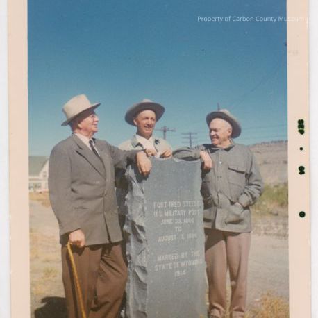 Update 2009: Color print, snapshot. Image of three men posed with a stone monument set up along a dirt road. Men are dressed in slacks and jackets and wearing hats. Man on left is holding a cane. Monument is commemorating the Fort Fred Steele Military Post and was erected in 1914.