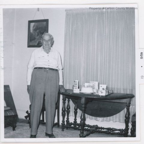 Update 2008: Black and white print. Snapshot. Full length image of an older man dressed in medium colored slacks, white shirt, dark belt and shoes, standing beside a drop-leaf table with a cake and cards arrayed on the top. Table positioned in front of a curtained window. Painting on wall andother furniture in background.