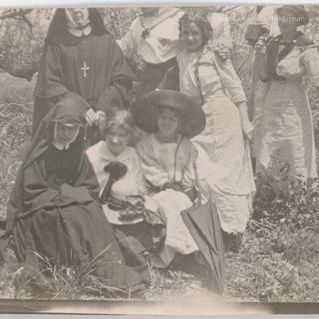 Black and white print of a group of nine women. They are outside in a grassy area, three seated and six standing .The two on photo left are in nuns habit clothing, long black robes with hood covering and white collar and cloth around their face. Others are dressed in light colored print dresses, holding or carrying hats. Photo has cut off the head of three women. Background is trees and bushes.