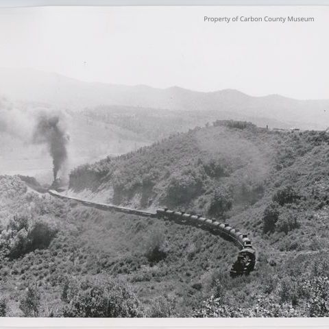 Update 2/2010: Black and white print showing a very long train pulling multiple flat rail cars and oil tankers through a deep mountainous area. A high overlook is seen at top right with a car parked and a person standing at overlook edge. Engine has dark smoke plumes emanating from engine smoke stack. Foliage covers all visible hills.
