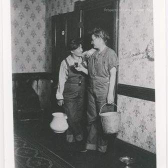 Black and white copy print of two women dressed in work clothes carrying buckets. They have bib overalls with rolled up pant legs . The women are looking at each other and one has her arm on the others shoulder. The wall behind them has a door and large print wallpaper. On photo right on original is written: "Clauder Moles". Written on back in black: April 28, 1907".