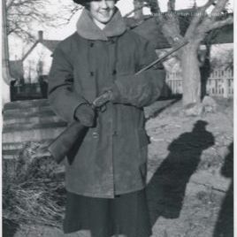 Black and white copy print of a woman standing outside holding a rifle. She is wearing a dark heavy coat with furry collar, a dark hat and gloves. She holds the rifle across her front with barrel up on her left arm and butt in her right hand. Houses are in the background with trees. A wood barrel with metal straps is on photo left.