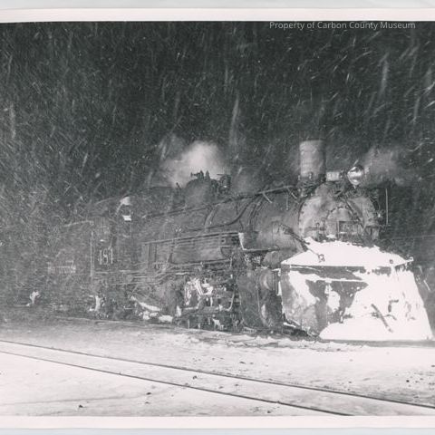 Update 5/2010: Black and white glossy print of a large train engine. Number "484" is on front and on a rectangular plate on the top. Snow is falling and snow is also caked on a large wedge plow mounted on locomotive front. Painted on side of cab is "Rio Grade". On engineer cab is "484" painted in large numbers. Steam is coming from top of train.