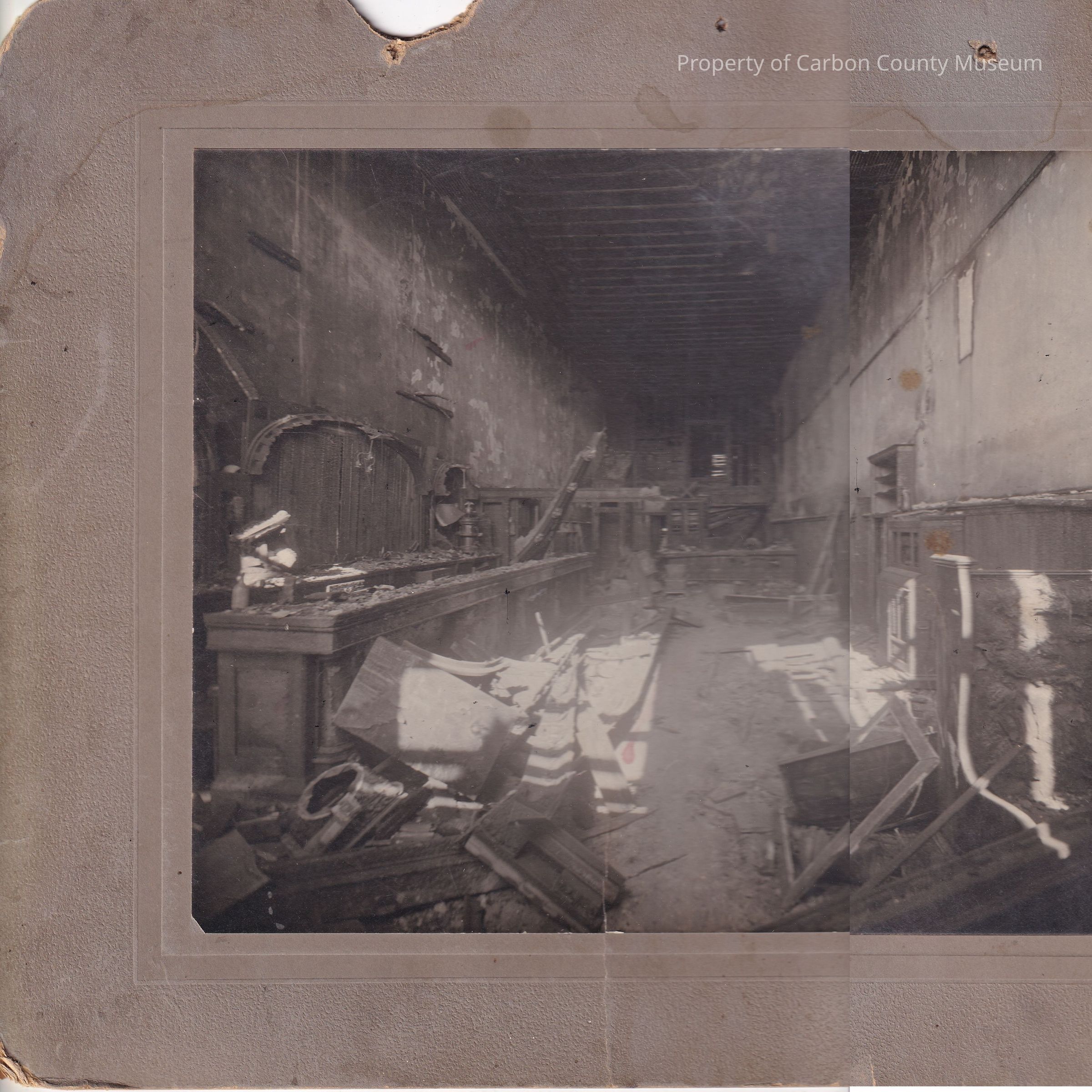 Oversized black and white cabniet card photograph, photograph is of a destroyed bar room - the ceiling beams are exposed, debris covers the floor, furniture is in disrepair.Collection