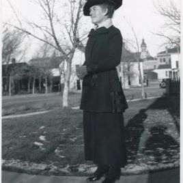 Black and white copy print of a woman dressed in a dark skirt, jacket and hat. She is standing on a sidewalk surrounded by grass and houses in the background.