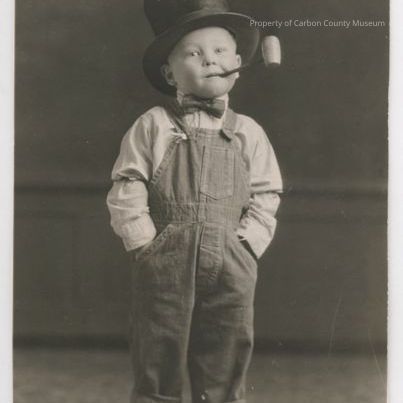 Update 2008: Black and white print. Studio portrait. Full length. Printed on postcard paper. Image of a young boy wearing overalls, a white shirt, bow tie, and top hat. His hands are in the pockets of the overall and he has a corncob pipe in his mouth. Pant legs of the overalls are turned up into cuffs. Patterned rug or carpet on floor. Painted backdrop behind.