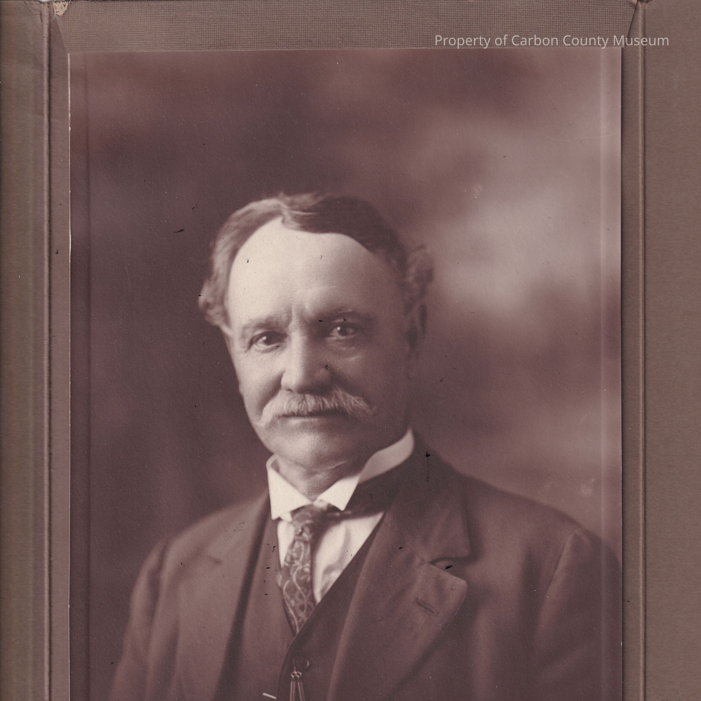 A studio portrait of a man secured in a folding cover. The front of the cover features text that reads "Kohler 917 1/2 S. Broadway Los Angeles". Writing inside the cover reads "Compliments of Father to Harry 12 - 24 - 19."Collection