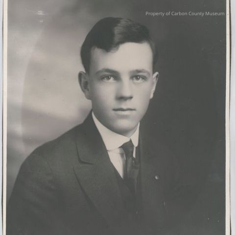 Update 2/2010: Black and white print. Studio portrait. Mounted on grey paperboard. Head and shoulders portrait of a young man in a 3 piece dark suit, dark tie and white shirt. He has short dark hair and is clean shaven. Painted backdrop behind.