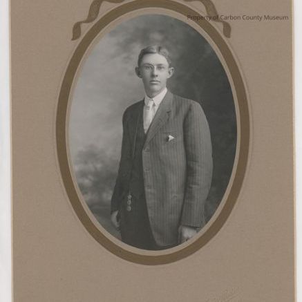Update 2/2010: Black and white print. Studio portrait. Oval. Mounted on tan matboard with a brown oval frame around image that has ring and ribbon bow at top. 3/4 length portrait of a young man in a 3 piece striped suit, white shirt and white tie standing in front of a painted backdrop. His hair is parted in the middle, he is clean shaven and wears glasses.