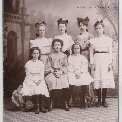 Update: 2/2010: Sepia print. Studio portrait. Mounted on grey matboard . Full length portrait of seven young girls in front of a painted scenic backdrop. Girls are all in calf-length dresses; girls in front are wearing dark tights; seated girls have dark hightop lace-up shoes; standing girl has dark ankle high lace-up shoes. Most have their hair pinned up or pulled back with large bows; two youngest have their hair loose. Patterned flooring.