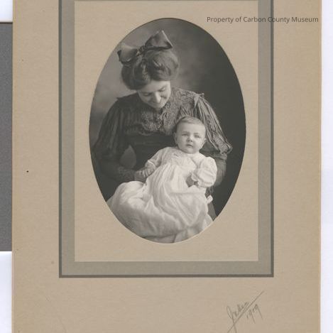 Update 2009: Black and white print. Photo of a lady and a baby. Lady is seated and holding the baby on her lap. She is looking down at the baby. Lady has on a dark dress with long sleeves which have lace inserts p the sleeve and at the cuff. Dress has a square lace collar. Her hair has a big bow attached on top. Baby is in a long white dress . Photo is oval shaped and mounted on matboard.