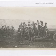 1. Image of a group of people sitting on a vintage car. Approximately 15 men and women, most sitting in & on top of open car. One man sitting on the running board & one man standing on the ground. Car is long, spoke wheeled, with a spare tire mounted on the running board. Small trees on photo left & a hill are seen in the background.