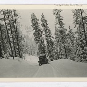 1. Vintage car driving through tall pine trees with snow on the branches. Car is on a road that has tracks through the snow.