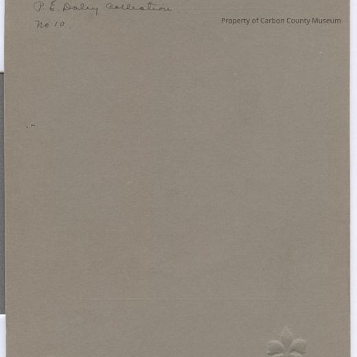 Update 2009: Black and white print. Photo of a gentleman in a high collar dress shirt and dress jacket and vest. Large dark tie. Man has an angle pin on his left lapel. He has a handkerchief in his top left jacket pocket. His hair is cut short, parted on left side and combed to right side. Photo is oval shaped and mounted in light colored matboard. Stamped in right lower corner" The Ferris Studio Rawlins, Wyo." A decorative design in feathers is stamped on the right lower corner.
