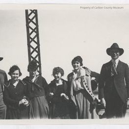 1. Six people; two men & four women standing in front of a lattice frame post. They are wearing suits & dresses or skirts with jackets.