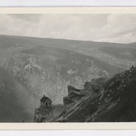 1. Steep canyon walls. A small building sits on the edge of the canyon with another small building higher up the slope. A white post & pipe barrier is at top. Power poses beside barrier.