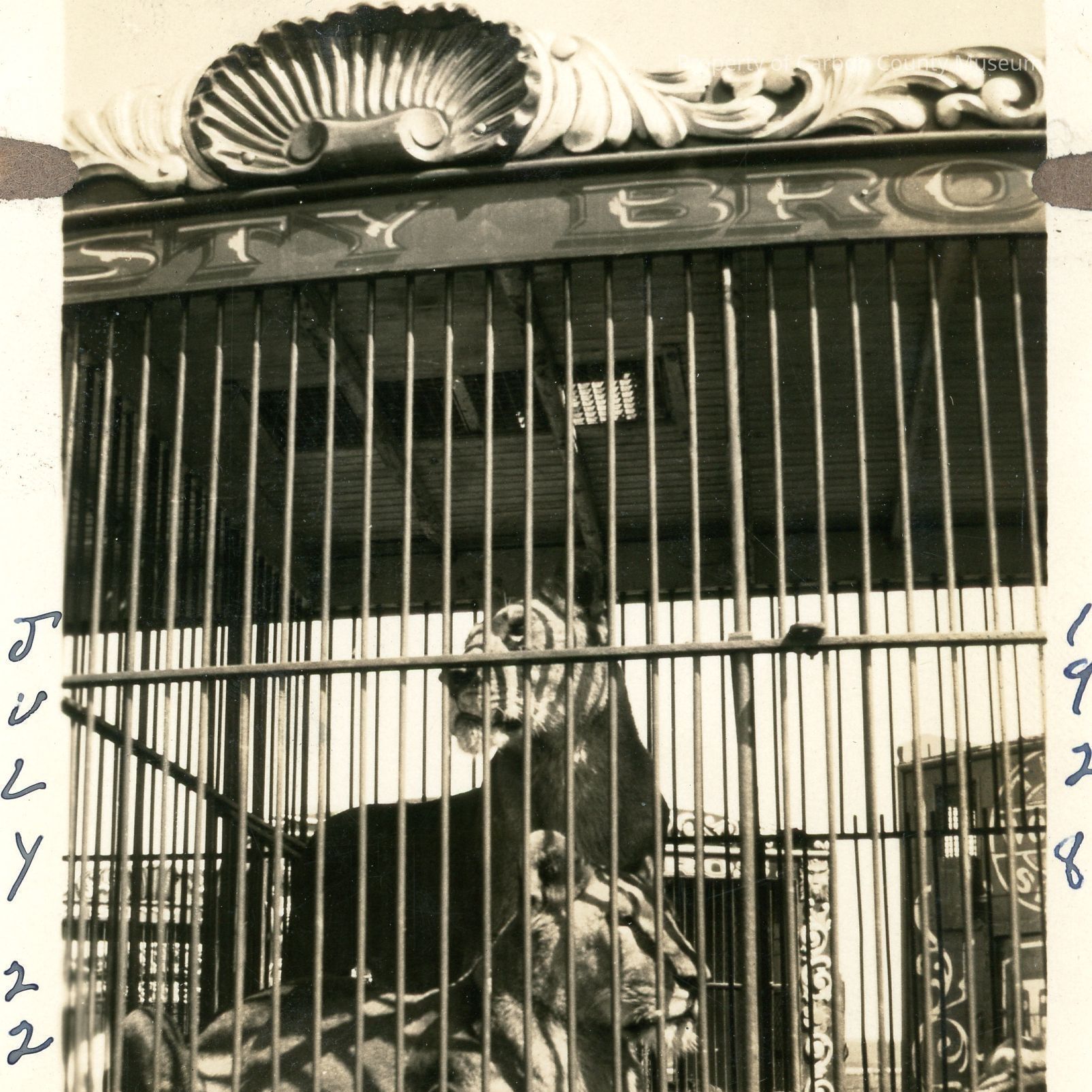 Black and white photograph. A pair of female lions are in a cage, text below the bars reads "KEEP AWAY". Written along the top edge of the photograph is "RAWLINS", written along the bottom is "LIONS", written vertically along the left is "JULY 22", written vertically along the right is "1928". Printed on the reverse is the number 28, also present is a circular green stamp that reads "MEYERS PHOTOS PHOTO FINISHING RAWLINS, WYO".Collection