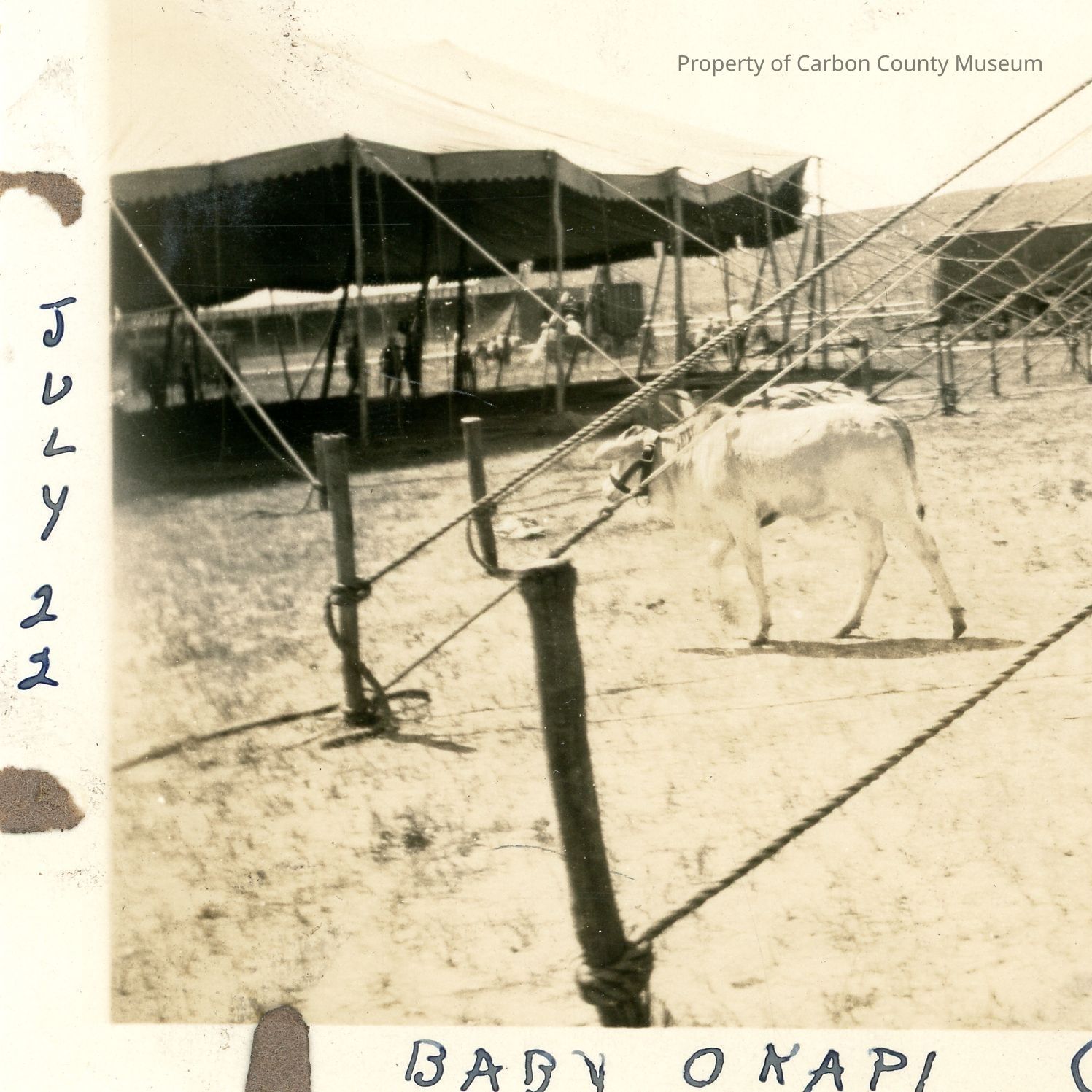 Black and white photograph. A white calf is walking between the ropes supporting a large tent. Written along the top edge of the photograph is "RAWLINS", along the bottom "BABY OKAPI (SACRED CALF)", vertically along the left "JULY 22", vertically along the right "1928". Printed on the reverse is the number 28, also present is a circular green stamp that reads "MEYERS PHOTOS PHOTO FINISHING RAWLINS, WYO".