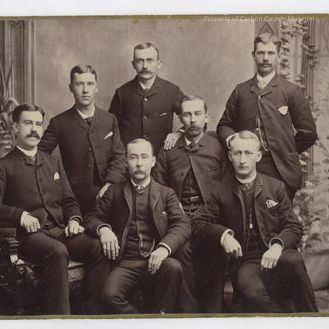 Sepia studio portrait on tan mat with gold border on top & bottom. Image of seven men; three are standing behind, other four seated. All men are wearing three piece suits & ties. four men have watch chains & fobs. Five men have mustaches. Two men have pinky rings, two more have rings on the third finger, all rings are on their left hands. A studio prop drape is behind them of plants on pillars & vines.