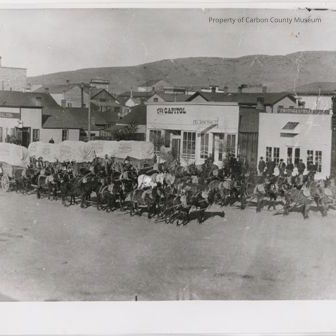 Black & white print of three rows of covered wagons in street. A large barren hill is seen in distance. Foreground shows dirt road. Teams of mules are hitched to wagons, Wyoming Transportation Company wagons. Wyoming Transportation Company signs are printed on the sides of the canvas wagon cover. Businesses behind them are "The Capitol" "The Bon Ton" "Photographs" "J. E. Osborne Rawlins Drug Store" "Hardware"