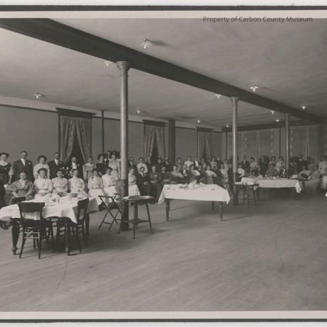 Update 2008: Black and white print. Snapshot. Mounted on black matboard. Image of a large group of men and women seated and standing along walls of a large banquet hall. Several tables with white table cloths positioned in large open room. Row of columns runs down center parallel to windowed wall. Window curtains pulled back and tied below center. Wall in background at right has two very large windows with 3 panel curtains which are drawn. Open bulb light fixtures spaced throughout ceiling.