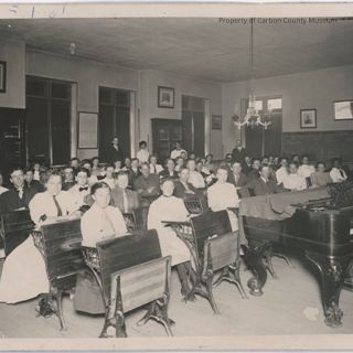 Black & white print on black paper of a class room. Boys & girls are sitting at desks in six rows. A flat top piano is in front of them on photo right. A three lantern light fixture hangs from ceiling. Two men & two women stand behind the students. There are four large windows with blinds & walls have pictures. Two glass front book cases are against back wall.