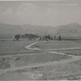 Black & white print of a rural scene. A rocky mountain in the background & a tree area with some buildings in front of that. Three dirt roads from there to photo foreground. Fences cross both roads going from main road.