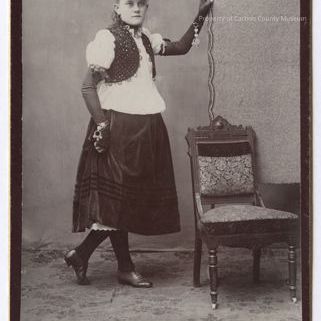 Update - 2009: Black & white print. Studio portrait. Mounted on black matboard with gilt edge. Full-length portrait of a young woman standing with her left hand on the corner of a wall. Her left foot back on the toe & her right hand holding up her skirt. She is wearing a white short-sleeved blouse; dark short vest; dark skirt with white petticoat; long, dark fingerless gloves; dark tights; & dark low cut lace-up shoes. Her hair is drawn up in close fitting hat; her bangs are high & curly. she has a dangly bracelet on each wrist. An upholstered side chair sits to the viewers right. Patterned carpet underfoot.