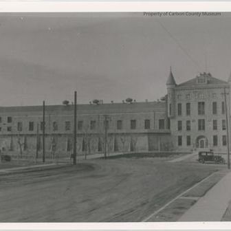 Black & white print of the Wyoming State Penitentiary. A vintage car is parked to photo right of main entrance sidewalk. Main entrance door is arch shaped with barred door. Above door are four levels with windows. Both top corners have spires & a dormer is in the roof. Two levels building attached to west side has many windows & four round vent fans on the roof. Barren trees are in front on photo left. Another vintage vehicle is parked beside a wood pole fence on photo left. A wide dirt street is in photo center.