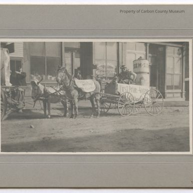 Update 2009: Black and white print of Shrine Parade on 100 block of 5th street. Image of a wood spoke wheel wagon being pulled by a donkey and a horse. Cloth sign over horse reads: "Improved motor (unreadable) Future (unreadable)". Loaded in wagon is large barrel with picture of camel on it and "ZEM-ZEM" written near top. Wagon sits on dirt street in front of a store. Painted in window of store: "Wallaces Pioneer Grocery". A man on boardwalk points to another wagon only partially visible in photo left. Man standing has a military style hat, man in wagon has on costume with shoulder pads extending down front and Derby hat with light band. His arms are covered with knit, snug fitting long sleeves.