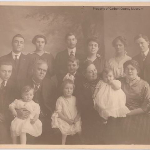 Update - 2009: Sepia print. Studio portrait. Painted backdrop behind. Family portrait. Four men, 5 women, 2 boys, 2 girls, & an infant. Infant and two girls in white dresses; men & boys in suits & ties; women in various styles of dresses & their hair is pinned up.