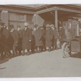 Sepia print of a line of men wearing feminine looking hats, some in long dark coats. On photo right is a vintage car with two men seated on a high seat. The steering wheel is a long rod attached to an almost horizontal wheel. A wood frame wire cage about the size of a phone booth is between the car & a brick building. Men are walking toward photo left. Building has an arch doorway & covered entrance with columns at outside corners.