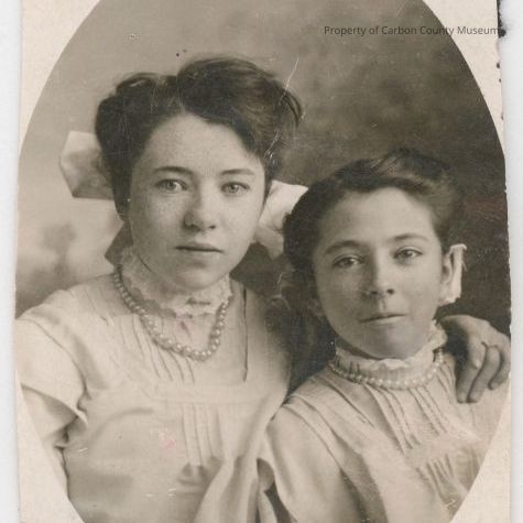 Update 2008: Black and white print. Studio portrait. Oval. Head and shoulders portrait of two girls dressed in white dresses or blouses with tucked fronts, long sleeves, and stand up collars edges with lace. Each has on a pearl necklace and is wearing a bow in her hair. Girl on the left has left hand draped over the shoulder of the other girl. Painted backdrop behind.