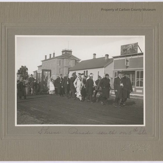 Update - January 2010: Black & white print snapshot. Mounted on grey matboard. Shriner's parade moving down a dirt street. Men in front of parade are wearing dark pants and long coats. One has a dark derby hat and one is wearing women's fancy hat with flowers on the brim. In the third row the man on the outside of row is wearing a Knights Templar fez and several other men all wearing women's hats. A man in the center frow has a white woman's dress over his pants and jacket, and a dark flat type brimmed woman's hat on his head. His right leg appears wrapped in a bandage. There is a man in a nightgown? with an apron over it, and a stocking cap on his head. At the end of the procession is a glass? and chicken wire enclosed booth with what appears to be someone seated in it, men and boys are walking to the side of it. A large tank with men seated on the top of it are at the end of the ling. The Carbon County Courthouse is in back of the photo with its three chimneys and widow walk showing on roof. The Mattas Saddlery is in right foreground. The window of the saddle shop has "saddles" painted in window. There is a white wooden house between it and the courthouse. The men are marching up the dirt road in front of these buildings.